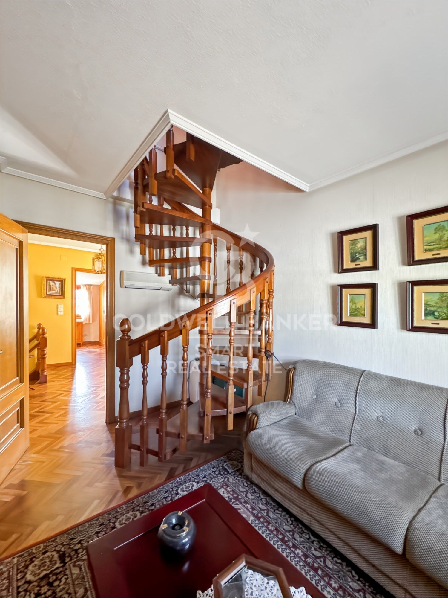 Subiendo por una elegante escalera de madera accedemos a la primera planta, que cuenta con tres dormitorios tipo suite, uno de ellos con vestidor. Desde un pequeño estudio se accede mediante una escalera de caracol al bajo cubierta, donde hay dos dormitorios adicionales y un baño compartido.