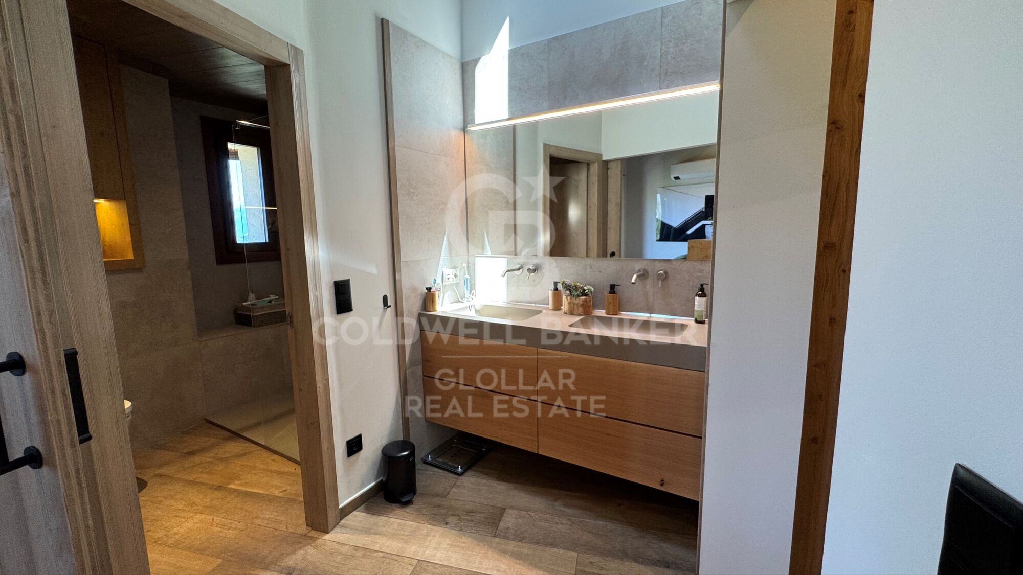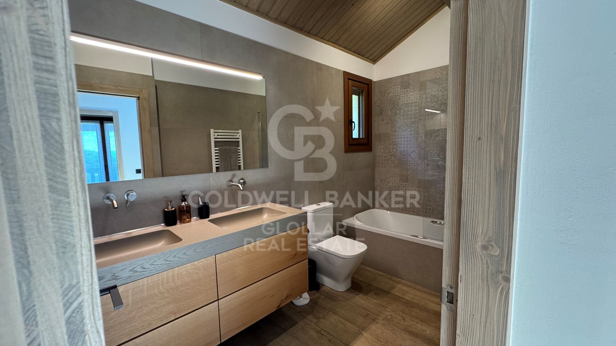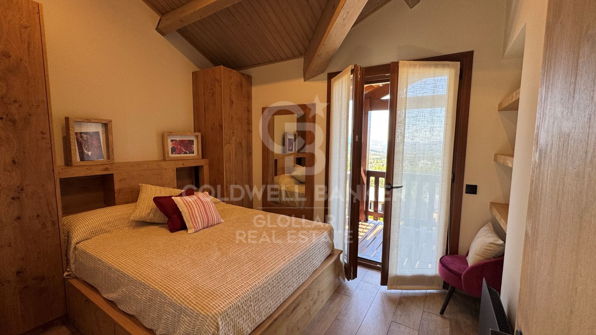 En la planta superior, los techos altos de madera aportan calidez y carácter a la zona de noche. Aquí encontramos tres habitaciones dobles, una de ellas en suite con vestidor y acceso a una terraza privada desde la que se pueden contemplar unas magníficas vistas. Las otras dos habitaciones comparten un baño completo, todos los espacios cuidadosamente diseñados para ofrecer confort y privacidad. La vivienda se completa con un garaje con acceso directo a la casa, trastero y zona de lavandería.