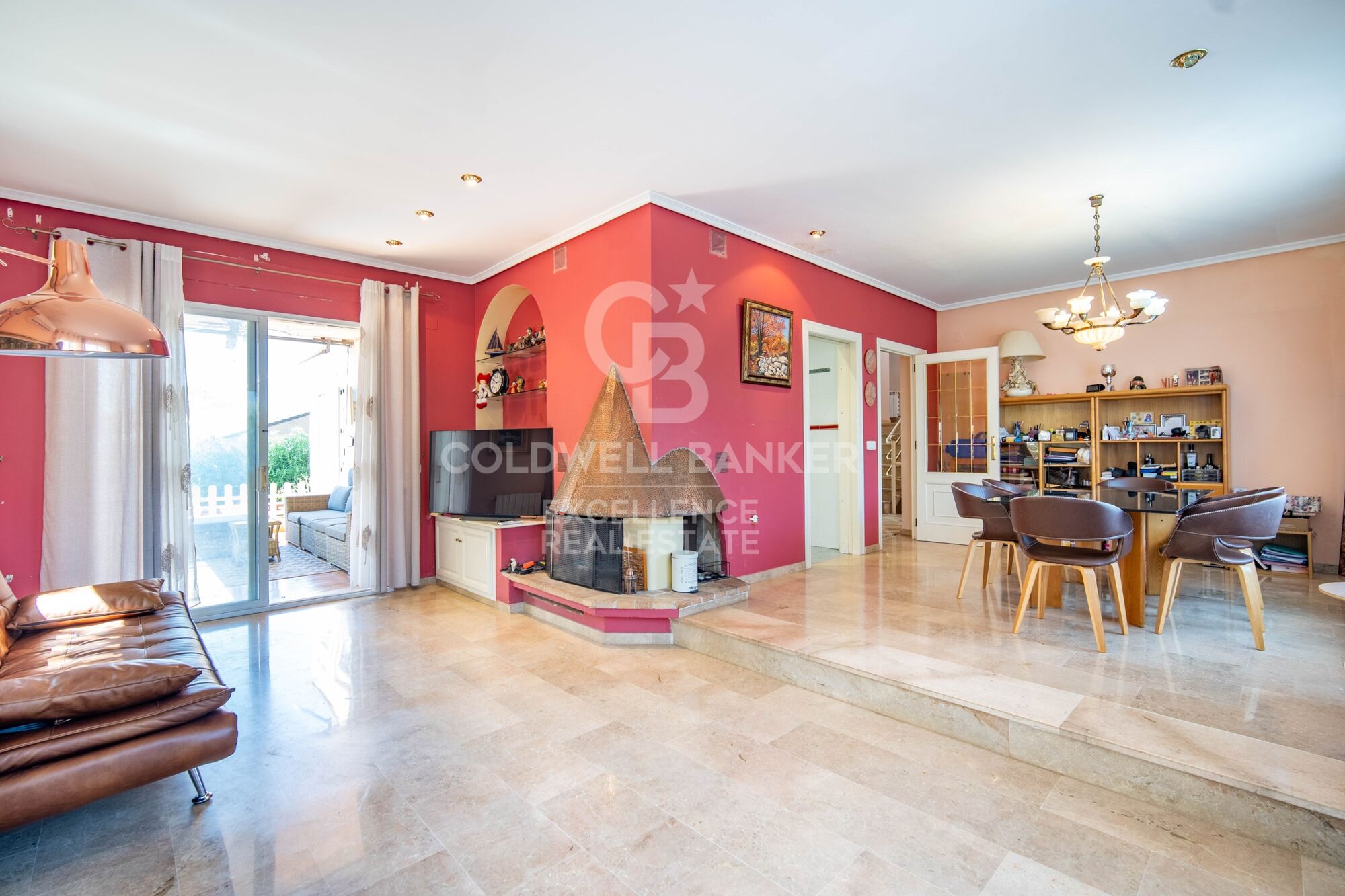 Salón-comedor con chimenea y acceso a la terraza