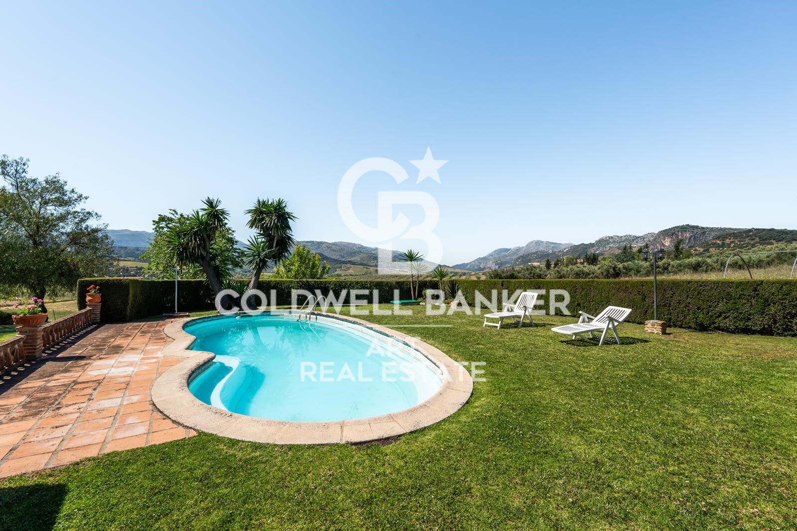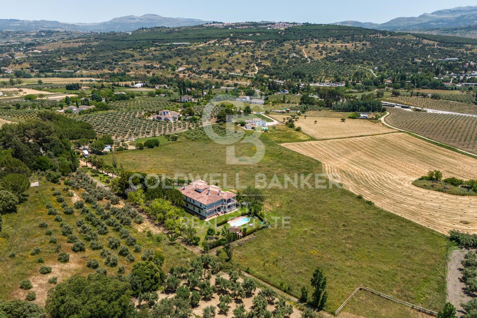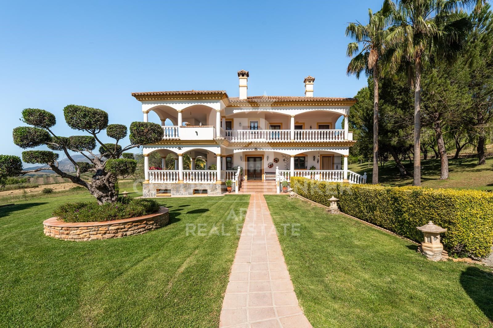 Este impresionante y verdaderamente único cortijo se encuentra en pleno campo andaluz, rodeado de colinas onduladas y con vistas panorámicas sin obstáculos. A tan solo 14 km del histórico pueblo de Ronda, la finca abarca aproximadamente 280.000 metros cuadrados de terreno e incluye su propio viñedo y olivares. Construida con los más altos estándares, la propiedad cuenta con unos 800 metros cuadrados de superficie construida, organizados alrededor de un magnífico patio central que recuerda a una hacienda tradicional. Esta residencia señorial ofrece múltiples posibilidades para el comprador: desde una ligera reforma hasta una completa transformación en un refugio verdaderamente espectacular. En el interior, un amplio hall de entrada recorre toda una ala de la casa, conectando con el salón principal, dos grandes salas de estar adicionales y la suite principal, todas con puertas francesas que se abren a una espaciosa terraza trasera. También cuenta con una gran cocina con comedor, área de servicio y cuatro dormitorios más, todos en suite y con acceso desde el patio central. La casa dispone además de una impresionante biblioteca, nueve chimeneas y conexión a internet de alta velocidad. El exterior no se queda atrás: jardines cuidados, una pérgola para comer al aire libre, amplias zonas verdes y una gran terraza que recorre toda la parte trasera de la propiedad. Majestuosas escaleras conducen a un jardín formal, mientras que una piscina de 16 metros por 6, con una profundidad central de 2,2 metros, completa este espectacular entorno ideal para el descanso o el entretenimiento. #ref:CBSH882