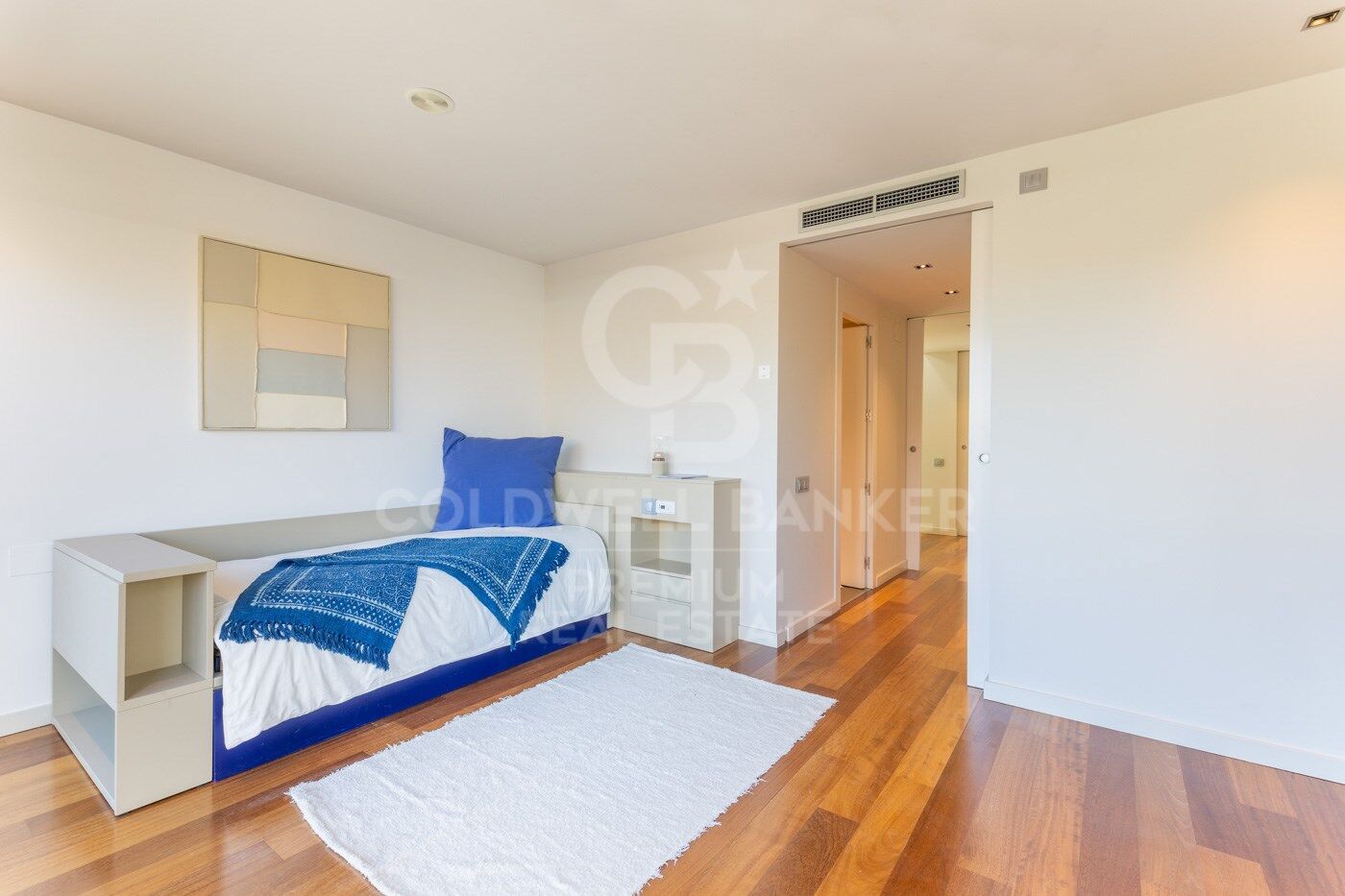 La segunda planta de 139,41m²y 37,12 m² de terrazas, acoge íntegramente el área privada. Se compone del dormitorio principal, que incluye zona tocador y vestidor, un inmenso baño y un área de descanso de 51,34m²con diferentes ambientes para descanso, trabajo o gimnasio. Además cuenta con dos espectaculares terrazas privadas que no sobresalen de la línea exterior de la construcción, desde donde gozamos de espectaculares vistas a La Mola. Todas estas estancias cuentan con grandes ventanales que dejan ver en todo momento las casas y jardines y zonas verdes vecinas.
