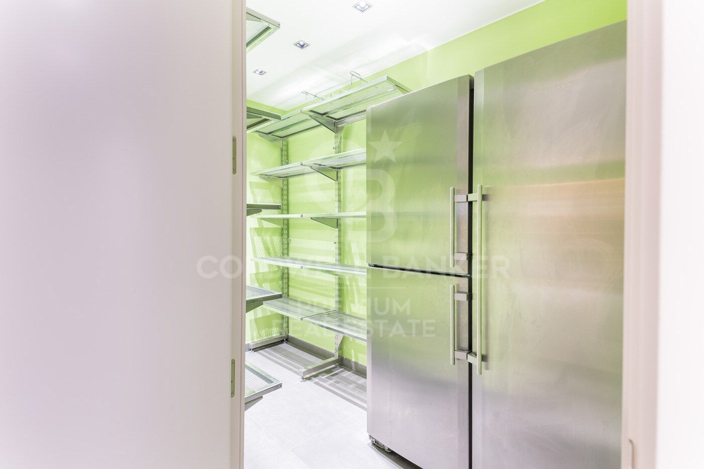 Comunicado con el salón comedor tenemos la cocina. Un espacio de 48,37m2 que incluye isla central para desayunos y office. Está equipada con todo tipo de electrodomésticos ( horno a vapor, horno pizzas, cocina asiática, vitrocerámica...) y una gran zona de almacenamiento. Desde la misma, a través de unos grandes ventanales accedemos a la barbacoa exterior.