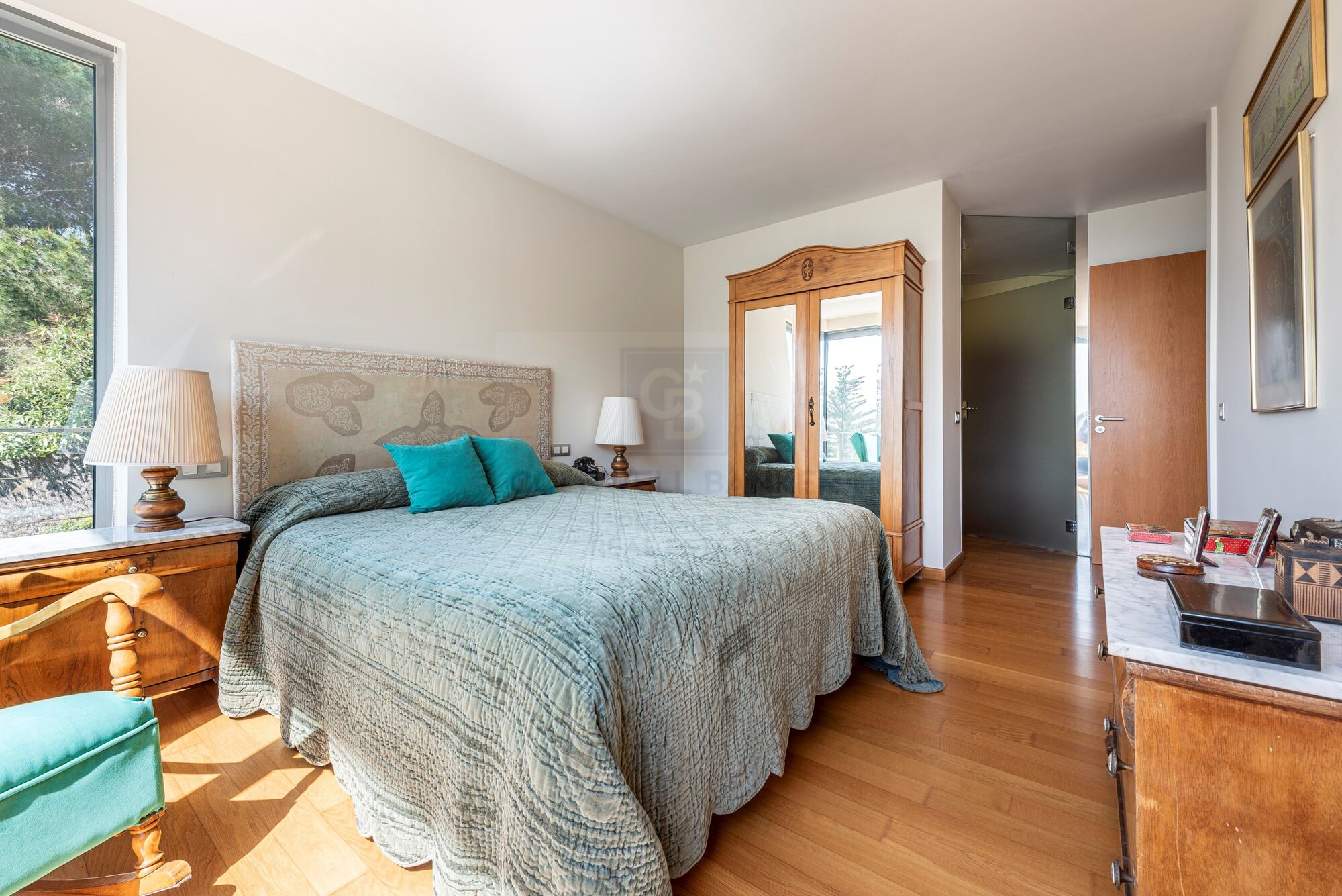 En el tercer nivel se ubica una zona independiente ideal para invitados o personal de servicio, compuesta por un dormitorio individual, baño con ducha, espacio de estar con kitchenette y salida a un porche que da acceso al jardín. También se dispone de un gimnasio, lavadero, bodega y un amplio garaje con capacidad para cuatro vehículos.