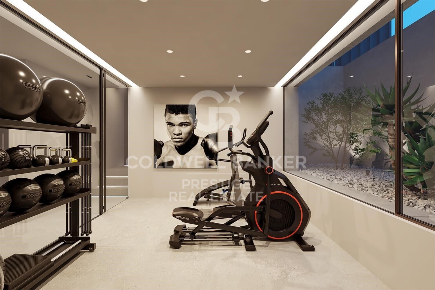 * Gym con baño integrado y pared de vidrio para dar transparencia a las estancias con patio ingles.