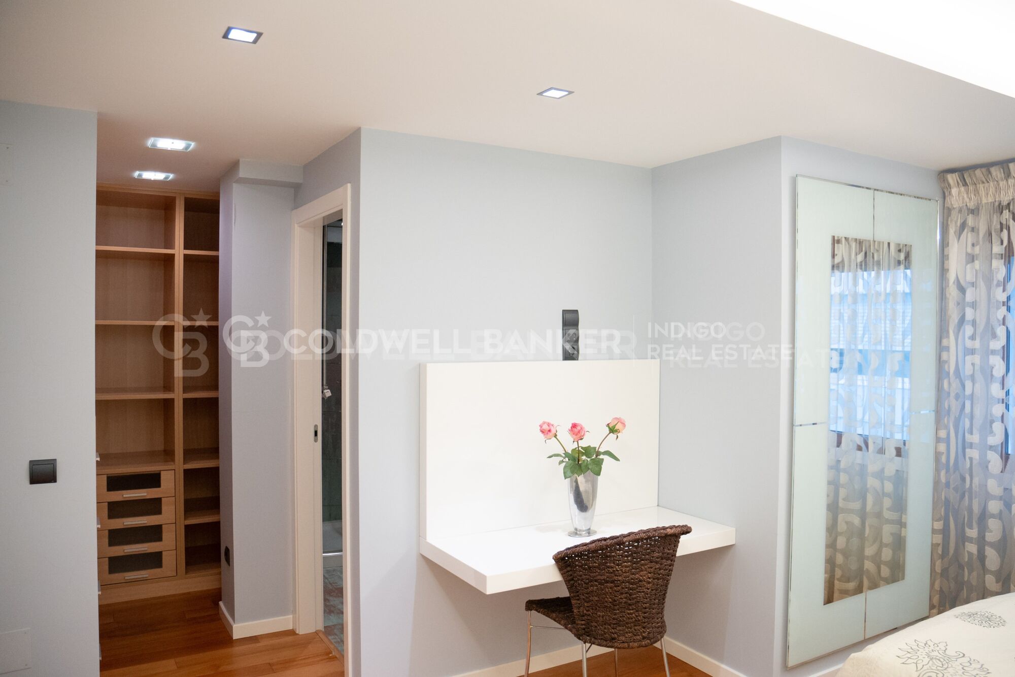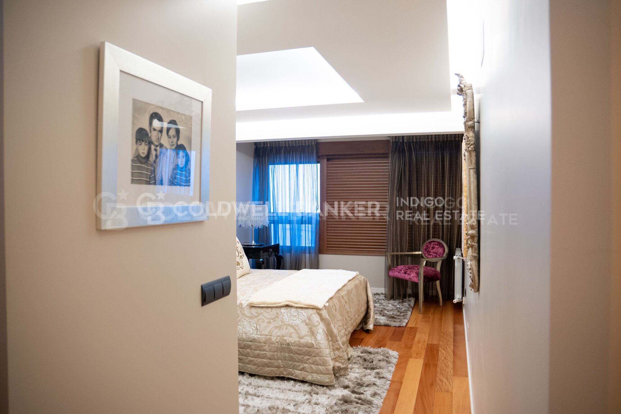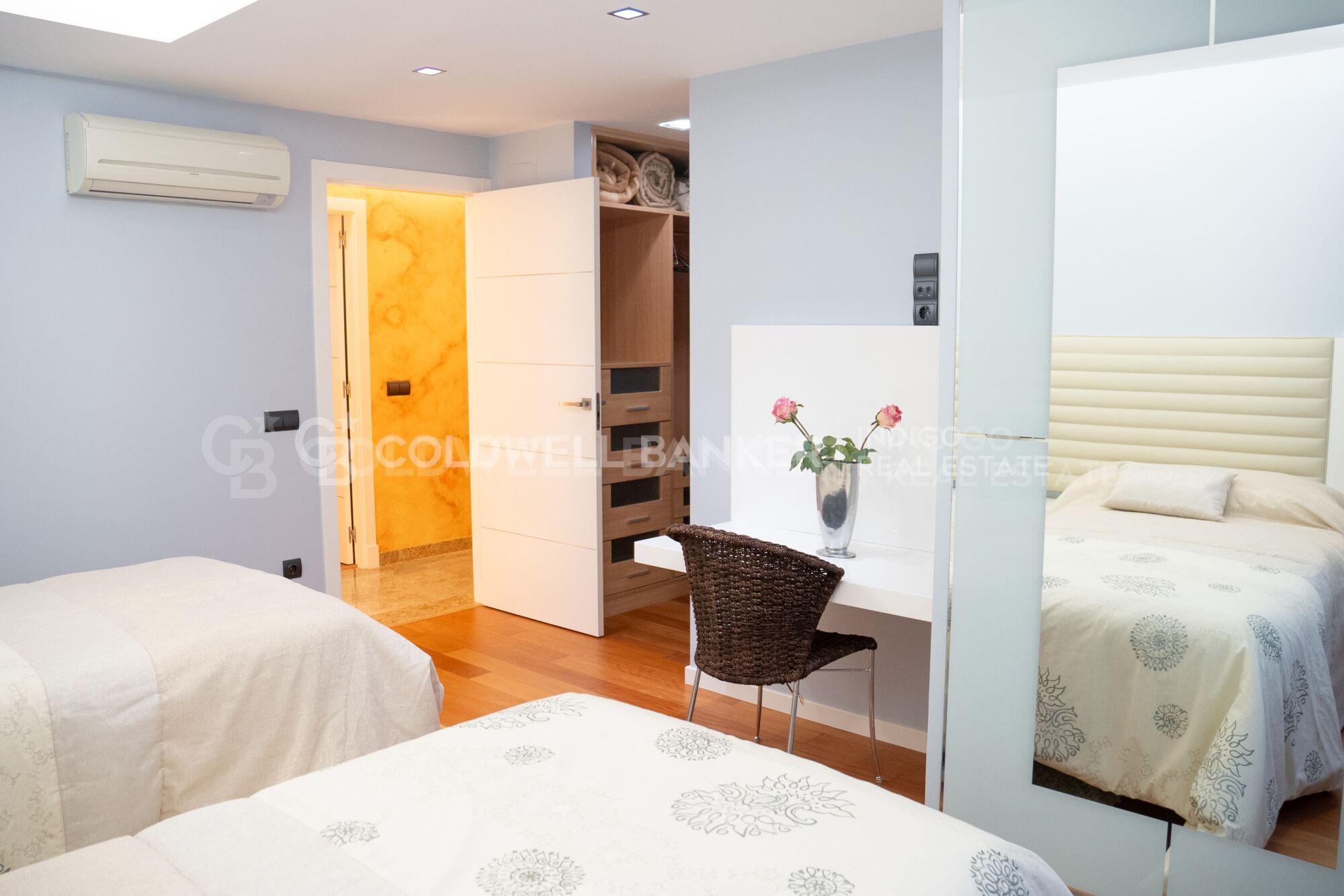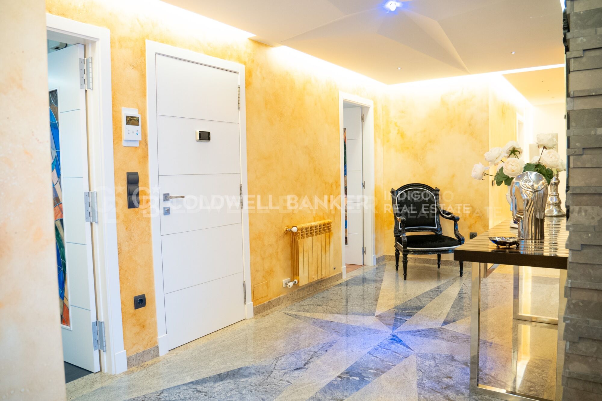 La vivienda cuenta con 5 dormitorios en suite, uno de ellos destinado al servicio, y 6 baños, entre los que destacan uno con sauna seca y otro con jacuzzi. Dispone de cocina independiente totalmente equipada con electrodomésticos de alta gama, zona independiente de lavandería y plancha, mobiliario italiano de diseño lacado de alta calidad y realizado a medida, vitreaux decorativos entre ambientes que aportan una cálida iluminación, cerámicas vidriadas artesanales en los baños, ventanas Climalit de madera con rotura de puente térmico y persianas eléctricas con cortinas y estores integrados.