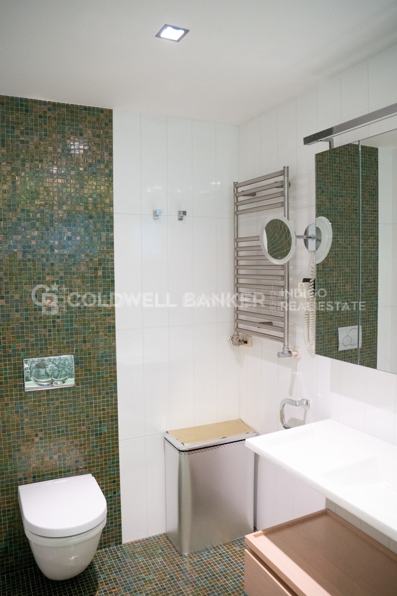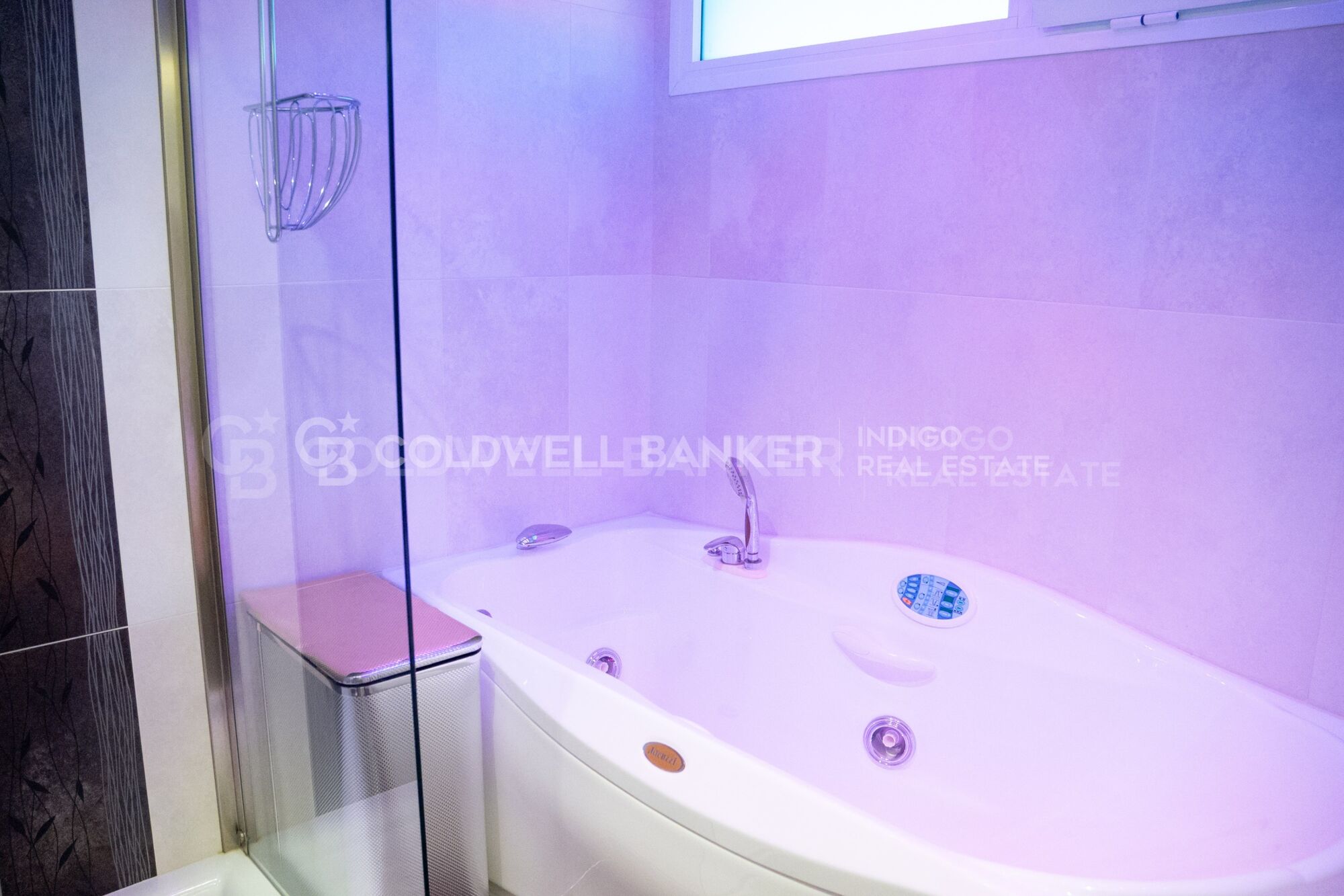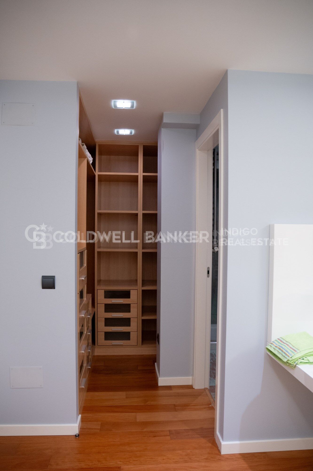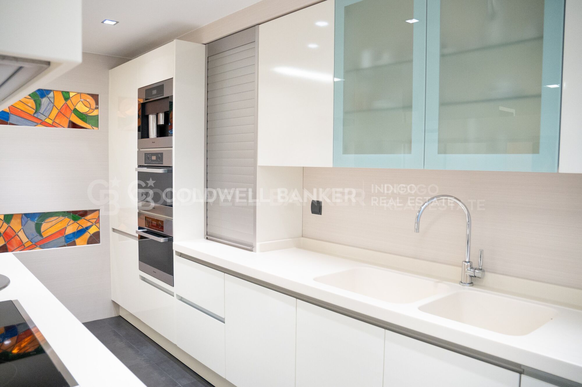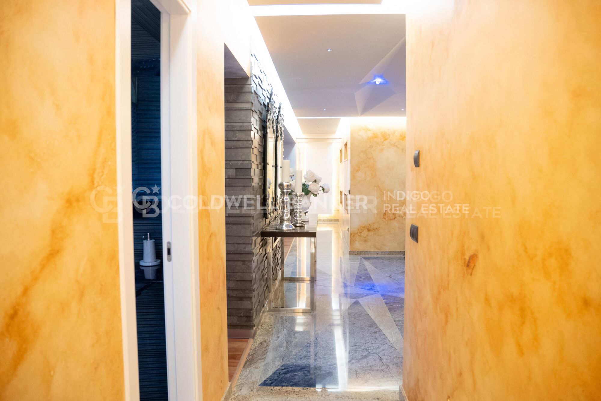 La vivienda cuenta con 5 dormitorios en suite, uno de ellos destinado al servicio, y 6 baños, entre los que destacan uno con sauna seca y otro con jacuzzi. Dispone de cocina independiente totalmente equipada con electrodomésticos de alta gama, zona independiente de lavandería y plancha, mobiliario italiano de diseño lacado de alta calidad y realizado a medida, vitreaux decorativos entre ambientes que aportan una cálida iluminación, cerámicas vidriadas artesanales en los baños, ventanas Climalit de madera con rotura de puente térmico y persianas eléctricas con cortinas y estores integrados.